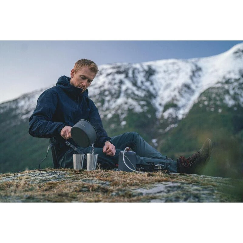 Une pratique trousse de cuisine avec deux grands pots, une poêle et un brûleur à gaz stable. Parfait pour cuisiner léger pour plusieurs personnes. Comprend une mallette de transport.